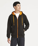 Full zip hoodie with contrast zip. Twin needle stitching detailing. Double fabric hood with contrast inner.Contrast flat lace drawcords. Kangaroo pouch pocket. Right hand side pocket has small hidden opening for earphone cord feed. Hidden ear phone loops. Ribbed cuff and hem. Worldwide Responsible Accredited Production (WRAP) certified production.